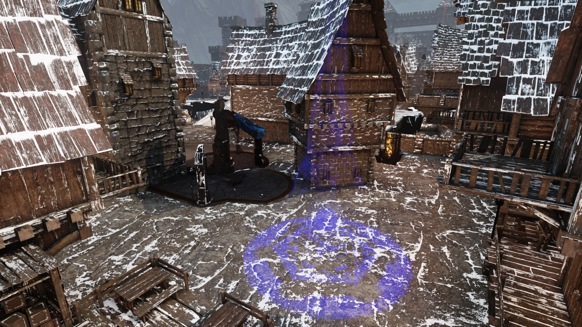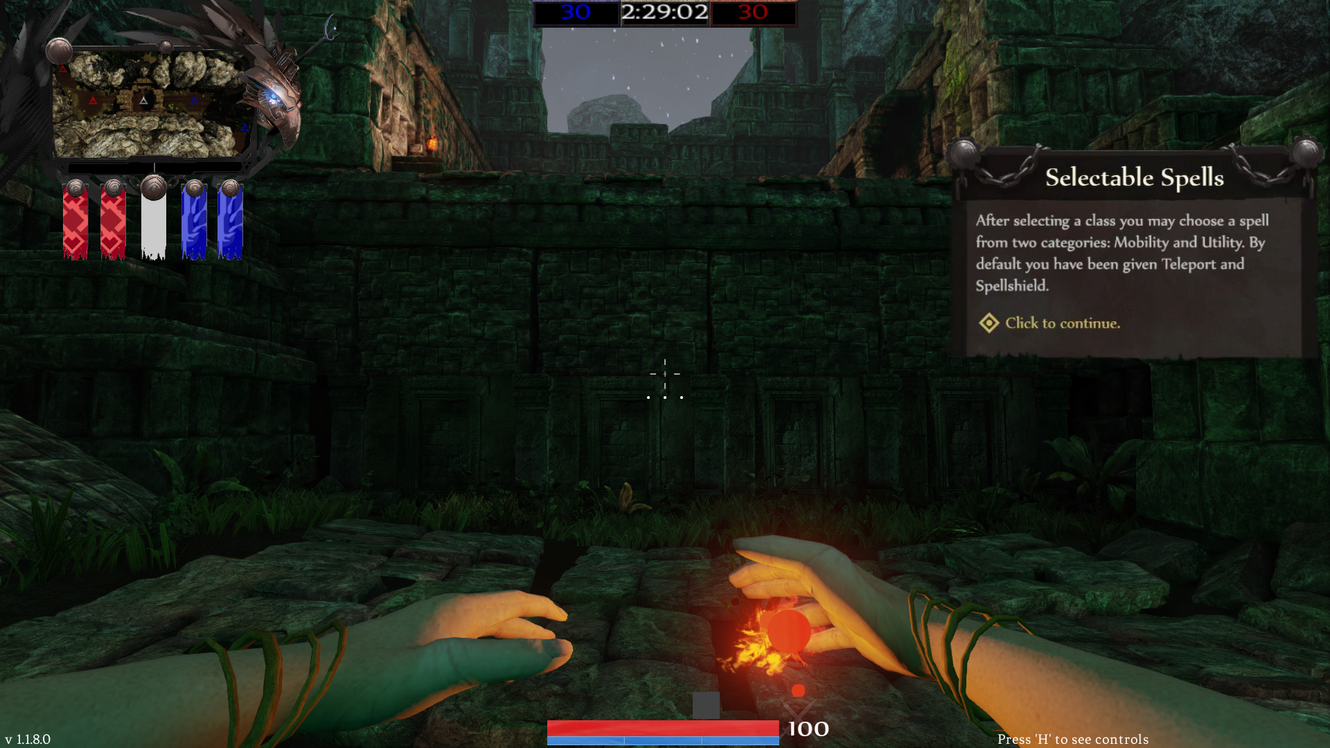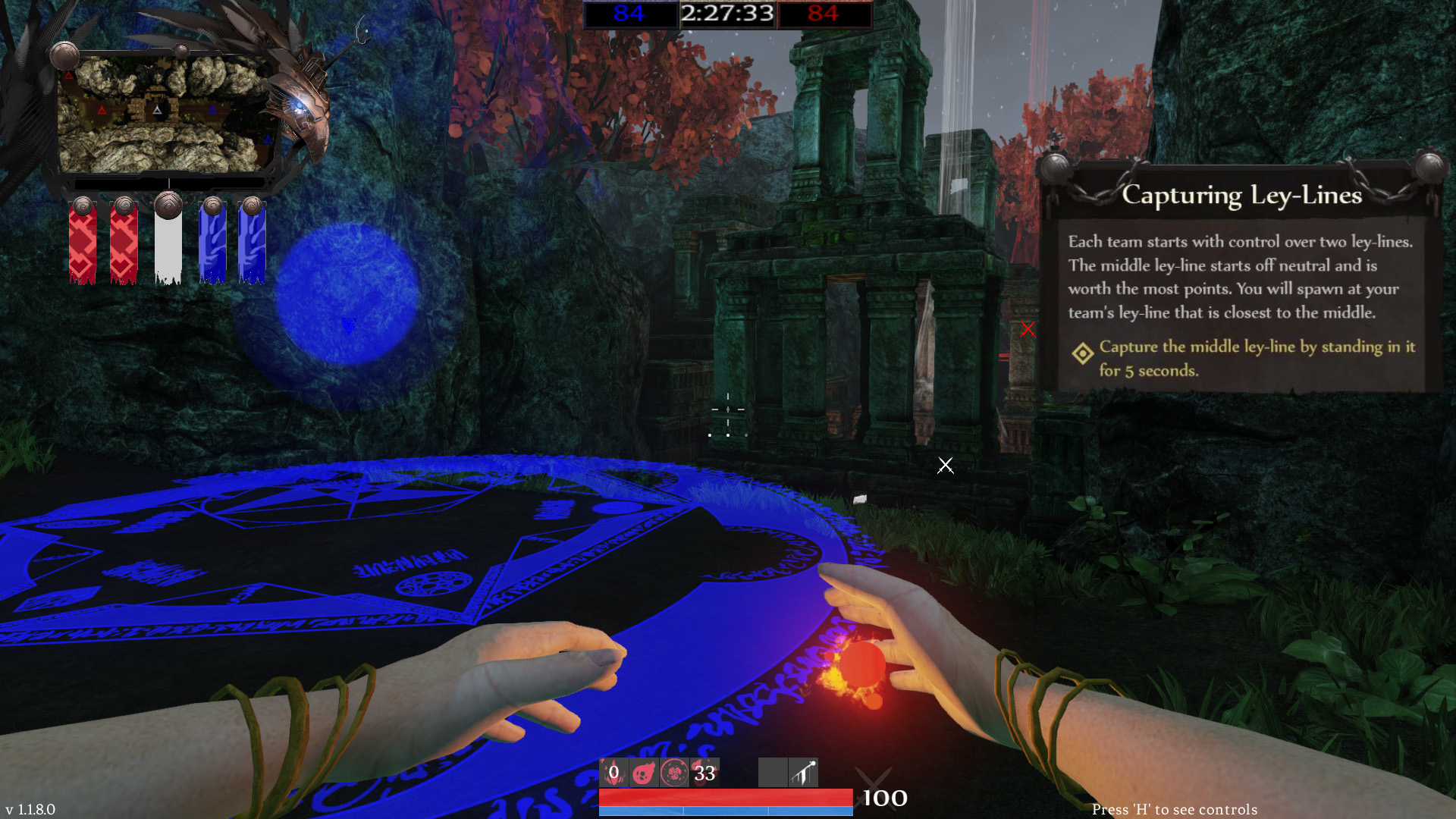 Players are divided into two teams: Validus (Blue) and Mangus (Red) and fight for control over powerful magic ley-lines which when controlled serve as a teleport back into battle.Every player starts in a basic spawn room and then can enter the map by traveling through the teleporter which takes you to the ley-line (control point) closest to the central point which your team controls.